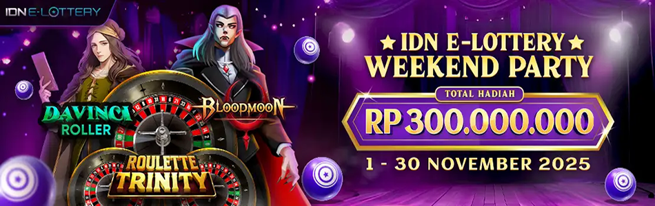 Weekend Party oleh IDN E-Lottery akan berlangsung mulai 1 November 2025 hingga 30 November 2025 setiap hari, pukul 00:00 WIB hingga 23:59 WIB. Total hadiah cash drop sebesar Rp 300,000,000 akan dibagikan kepada pemain yang beruntung setiap harinya.
